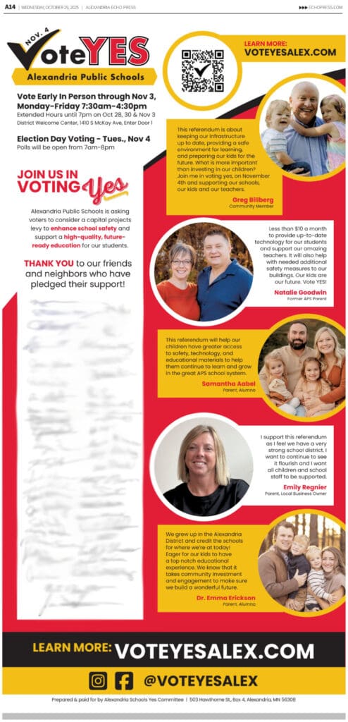 This full-page Echo Press ad wasn’t just ink on paper—it was a collective show of support from local businesses and neighbors who believe investing in our schools means investing in Alexandria’s future.